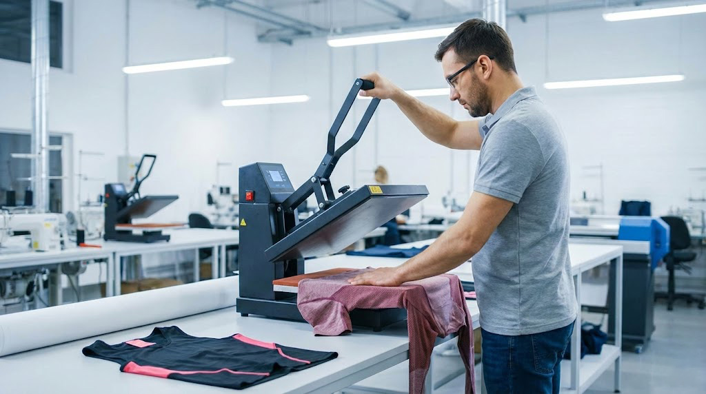 Heat transfer (specifically Silicone or Digital Transfer) involves printing the design onto a carrier and bonding it to the fabric using heat and pressure. This is the industry standard for high-performance gear.